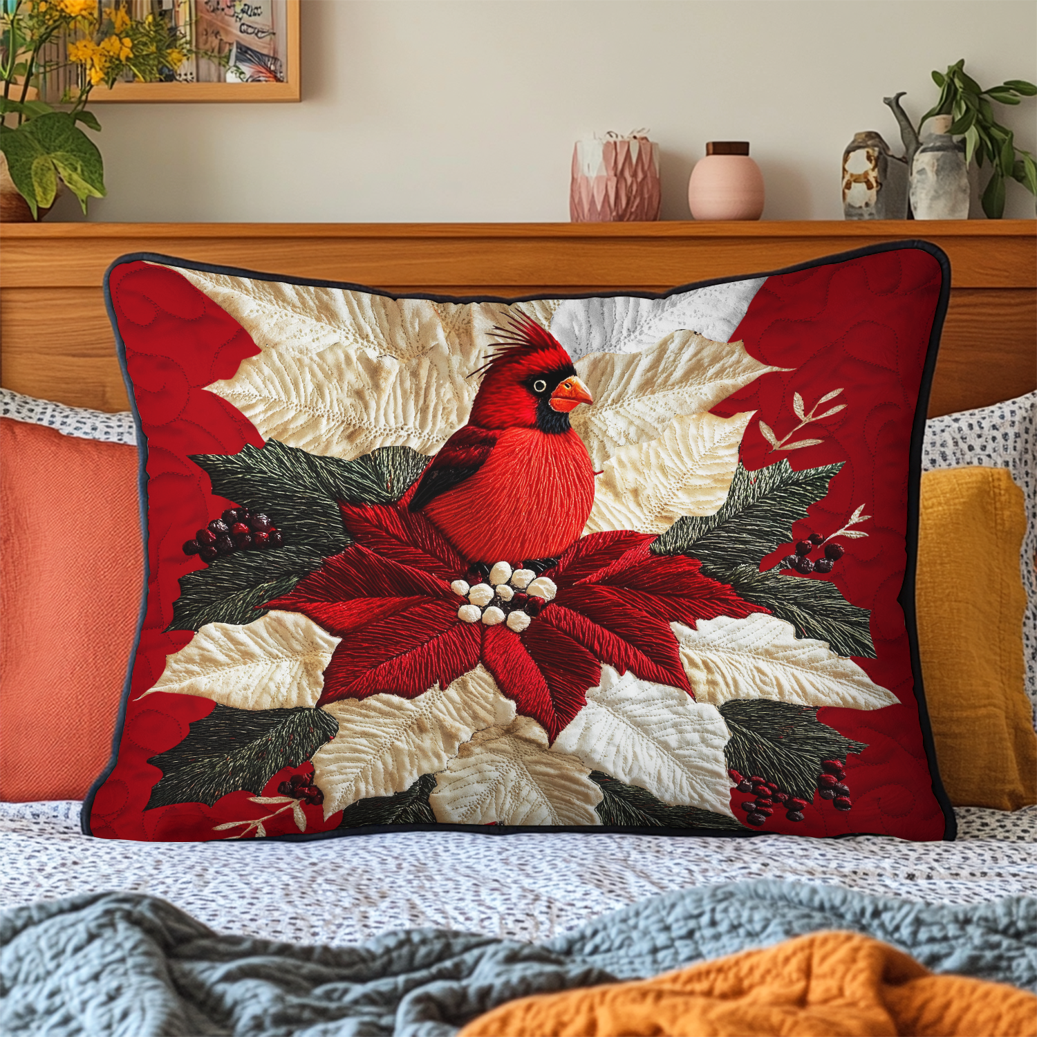 Poinsettia Cardinal Quilted Bedding Pillow Case NCU0VH976
